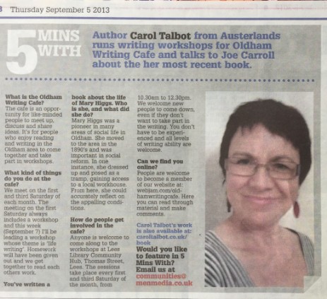 Oldham Writing Cafe meets on the first and third Saturdays of the month at Lees Library Hub from 10.30 -12.30